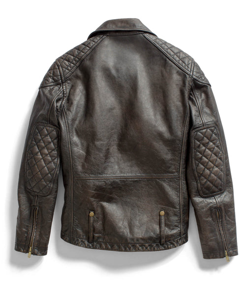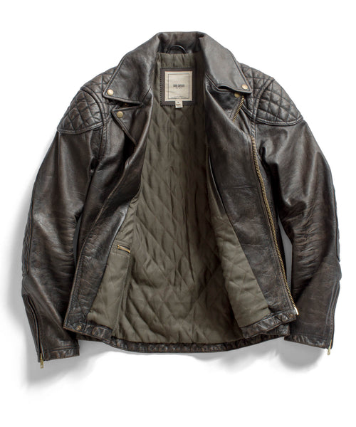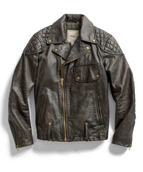 Outfitted with textured shoulders and elbows for a more rugged look, the Black Leather Motorcycle Jacket creates the perfect balance between cafe racer style and boss-hog mentality. Crafted from genuine lamb leather the jacket is made to make a bold statement wherever you go and is complimented well by a pair of our Blue Selvedge Denim.