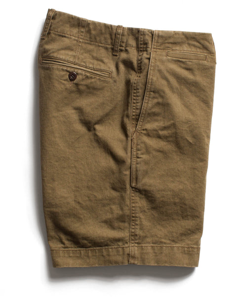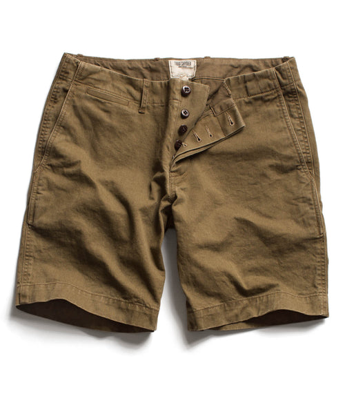 Our Brown Officer Chino Short is the ultimate statement of a torn down look. Inspired by Todd’s love for military design, the short is for off duty wear only. We suggest pairing with our Blue Micro Chambray Safari Shirt.