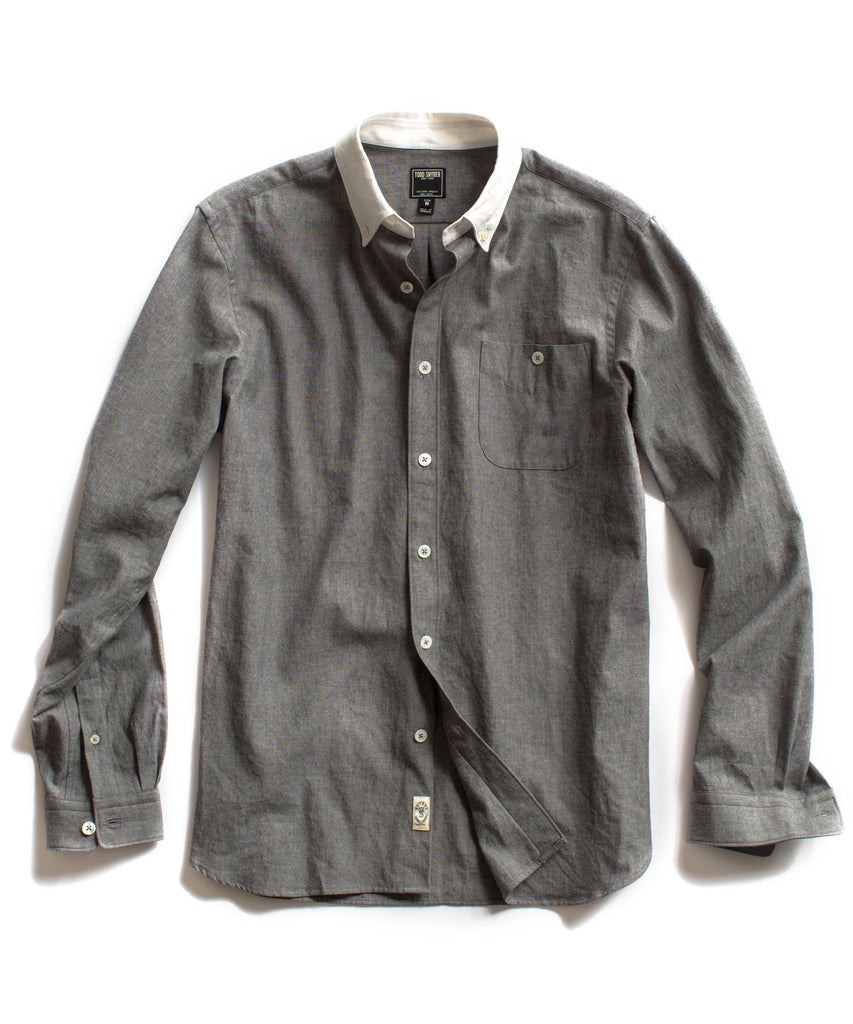 Made from chambray cotton the Grey Chambray Shirt With White Collar lends you the durability and texture of denim while adding a light fit.