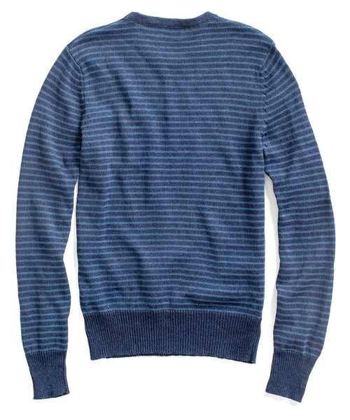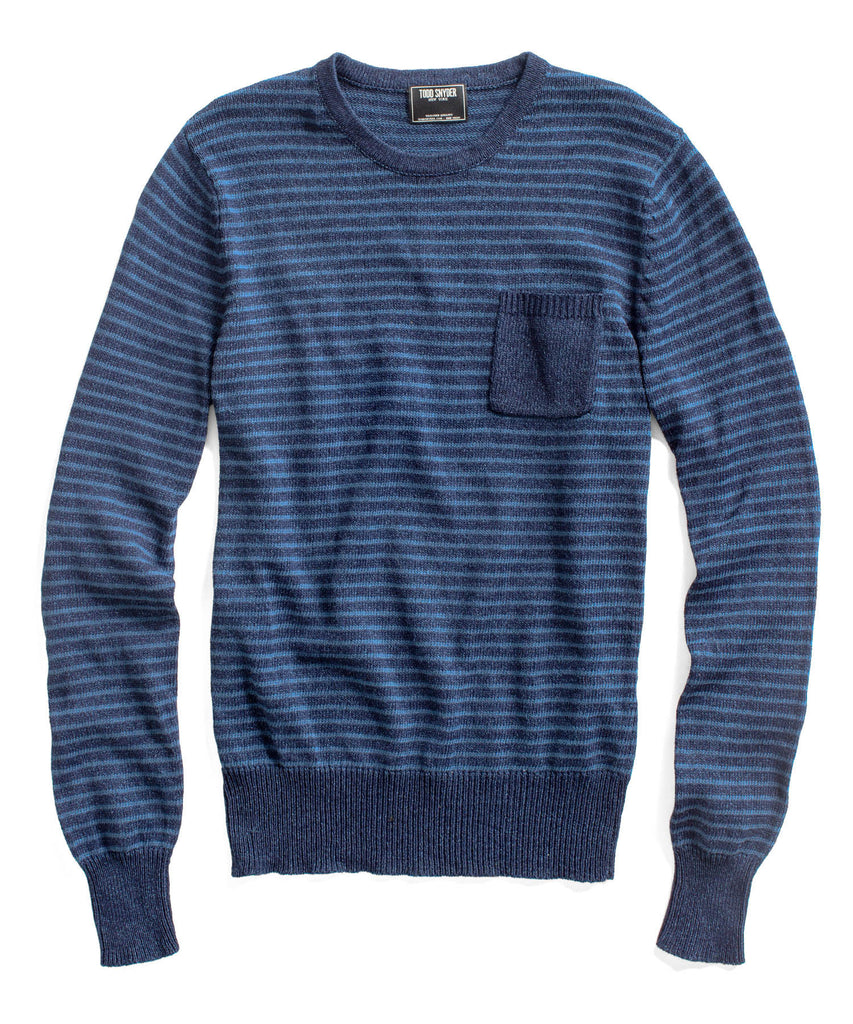 The Indigo Stripe Pocket Crew Sweater is knitted from the finest cotton and with the same care and quality we give to all of our sweaters. Outfitted with a bold palette, the sweater will become one of the most versatile pieces in your wardrobe. For a classically detailed outfit with a modern attitude, we suggest pairing with our Whiskey Selvedge Denim.