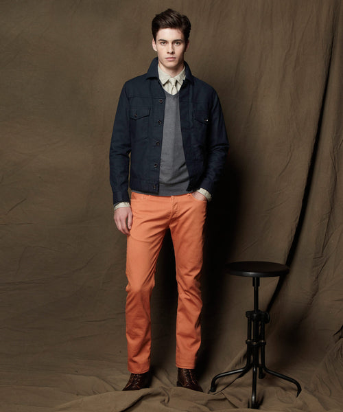 Durable and classic, our twist on denim fits the modernity of NYC and takes on the timelessness of what wearing denim is all about. Sewn with metal shanks and made with Italian cotton cavalry fabric this piece adds comfort and confidence to your denim collection. Our Navy Dylan Jacket goes deftly with our Olive Selvedge Officer Pant.