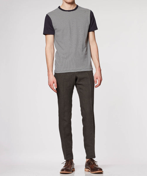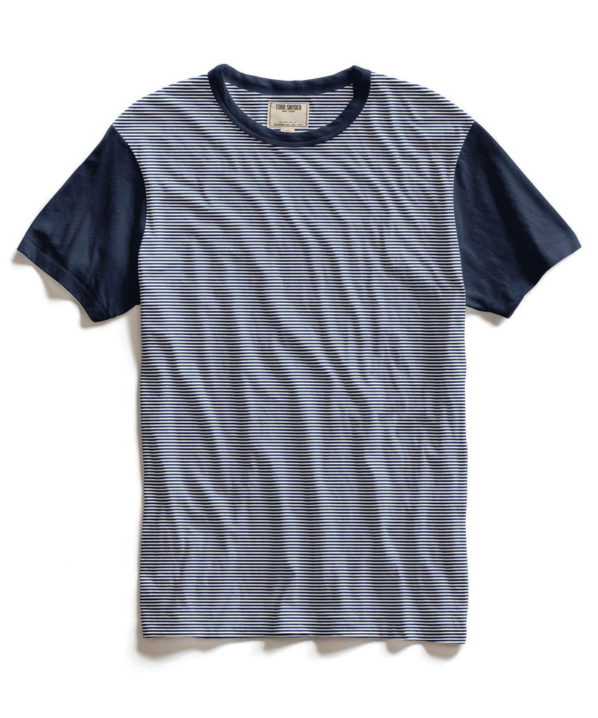 The Navy Crew T-Shirt with Contrast Sleeves is vintage themed and hits the right undertones with its fine horizontal stripes across the chest and body of the canvas. Made in Canada the shirt is crafted from the finest cotton, and makes a resoundingly great pair with our Indigo Selvedge Denim.