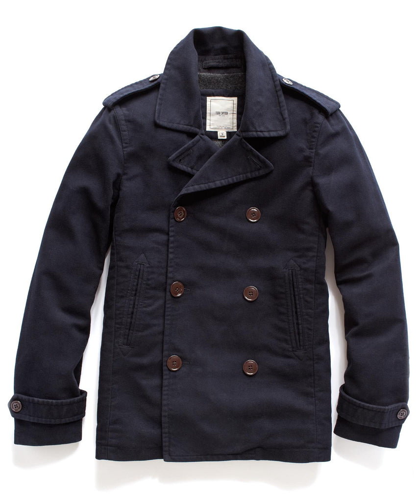 A well-tailored peacoat can fit every occasion. Ours is fitted with melamine buttons for a clean contrast to the navy moleskine. A fine partner to our Grey Plaid Shirt.