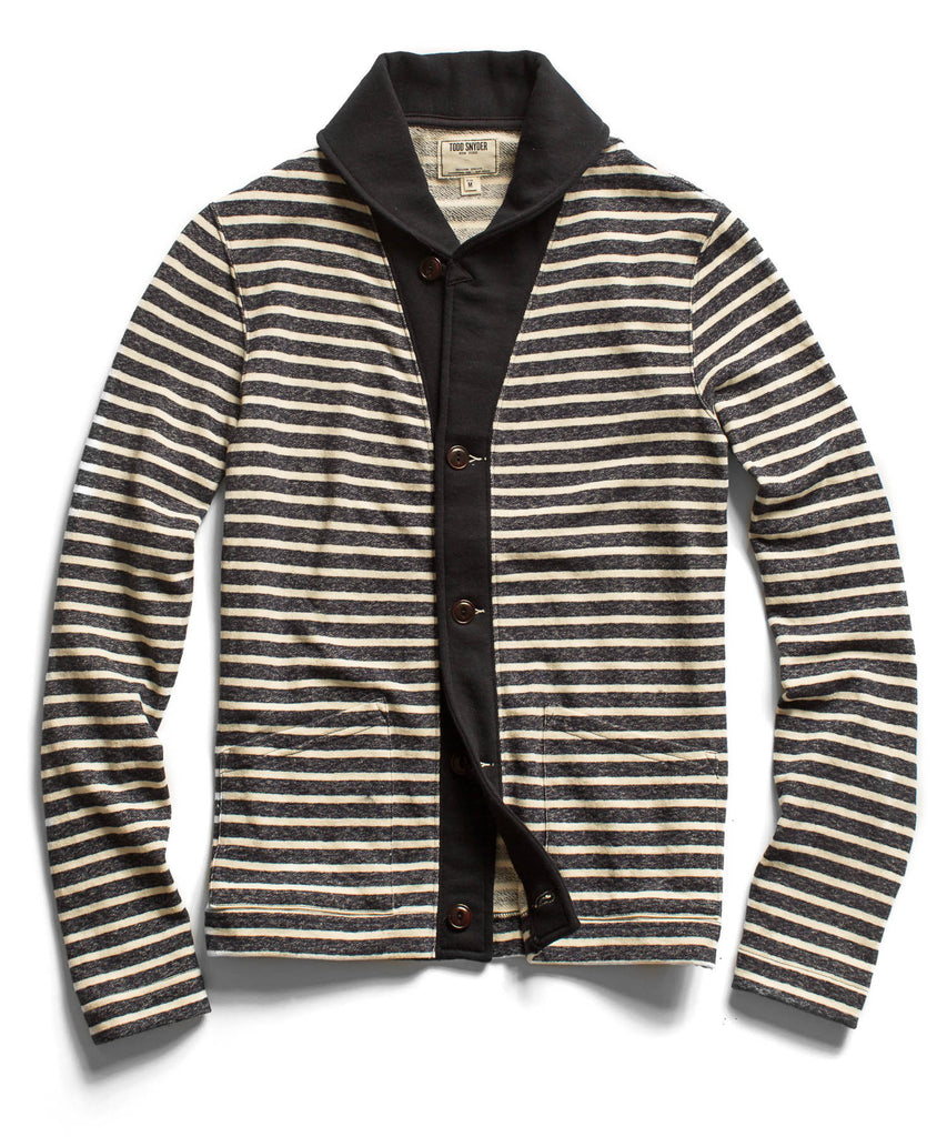 With the Navy Striped Shawl Cardigan, Todd has married quintessentially classic and modern styles into one comfortable and masculine piece. We suggest adding color to your outit with our Orange Bedford Cord Pant.